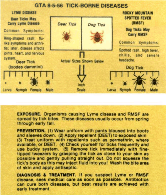 ![]() GTA 8-5-56 Tick-Borne Diseases Card This page updated 6 April 2001 The Army Medical Department Center & School (AMEDD C&S) developed a wallet-size Tick-Borne Diseases card as an official Graphic Training Aid (GTA) in 1989. The U.S. Army Center for Health Promotion & Preventive Medicine (USACHPPM, then the U.S. Army Environmental Hygiene Agency, USAEHA) assisted in its development. The card is available as a Department of the Army (DA) procurement item through local Training Support Centers (TSCs). Order GTA 8-5-56. There is no cost to Army components. For Department of Defense (DOD) components other than Army, or if you have questions, contact: Commander, U.S. Army Training Support Center, ATTN: ATIC-TMSD-T, Training Media Support Directorate, Training Media Management Team, Fort Eustis, VA 23604, DSN 927-4585 or Commercial (757) 878-4585. The approximate cost per card to non-Army components is $0.10. GTA 8-5-56 is a 2-inch X 3.5-inch, two-sided plastic impregnated tan wallet card that provides color photographs of the adult female deer tick and American dog tick. It also includes basic symptoms of Lyme disease and Rocky Mountain spotted fever on the front, and route of exposure to these diseases, diagnosis, treatment, and preventive measures on the back. Note: All Army Graphic Training Aids can be accessed on the General Dennis J. Reimer Training and Doctrine Digital Library website: http://www.adtdl.army.mil/atdls.htm Click on “Enter the Library”; then under“Type” choose “Graphic Training Aids” [Disclaimer Chicago Safety Institute provides this as information only no warrantees or anything is endorsed by us or the U.S. Army as to the accuracy of the material, it's use is solely the responsibility of the user.]