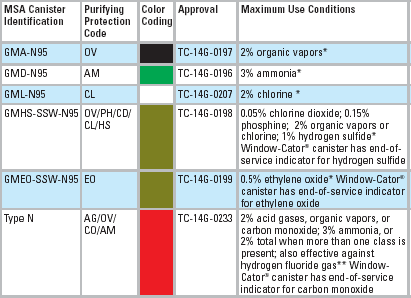 gases as indicated by canister identification. See the table for specific canister approvals. From a practical standpoint, gas masks are generally suitable for ventilated areas with relatively stable contaminant concentration levels. They should never be used in confined spaces or where oxygen deficiency and high gaseous concentrations may occur. Gas Super-Size Gas Mask masks may also be used for escape only from atmospheres in which the contaminant concentration does not exceed the maximum use condition of the gas mask. The Super-Size Gas Masks have a Window-Cator Canister, which contains an indicator to show the Window-Cator Type N Gas Mask Canister effectiveness of the canister against certain contaminants. The small round window in the front of the canister is an end-of-service-life indicator (ESLI). When the shade of the ESLI changes from its "Starting" color to the "Time-To-Change" color, the canister is beginning to lose its effectiveness and must be replaced. For more complete information, see Data Sheet 05-00-01. |