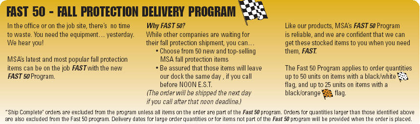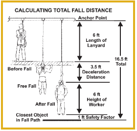 How do I know which to choose? There are two primary types of lanyards: • Shock-absorbing lanyards used when the freefall distance (fall hazard) can exceed 2 feet • Restraint or positioning lanyards used onlywhen free fall distance (fall hazard) can be limited to 2 feet or less In choosing the correct lanyard, you must keepthe application in mind. • Make certain the lanyard is the proper length to allow the necessary worker movement/ positioning. • Make certain that the right material type is chosen (depending on your work environment). – Cable works best in high heat environments or around sharp edges. – Webbing works best in most other applications. • Make certain you have calculated your totalfall distance . See diagram for more information.You also need to consider the compatibility of the system components. Components produced by different manufacturers may not be interchangeable. The best way to ensure compatibility is to purchase all components from the same manufacturer. ![]() |