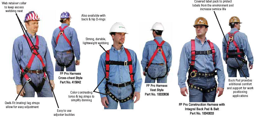 FP PRO HARNESS The FP Pro Harness provides comfortable protection even after long hours of use in extreme conditions due to its super lightweight features and durable webbing. The harness is available in cross-chest and vest styles, with optional hip D-rings for work positioning, and fits a wide range of body types and sizes. Color-contrasting thigh and torso straps simplify donning. The FP Pro Harness has the following features : • Bright red polyester webbing for high visibility • Meets all applicable OSHA standards, ANSI A10.14, and ANSI Z359.1 • Lightweight design for increased comfort • CSA certified |