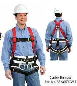 DERRICK™ HARNESS The Derrick harness was created with the derrick worker in mind. This harness incorporates an integral shock absorber that also serves as a back D-ring extension to allow for easy lanyard connection. The integral belt consists of a 4" wide web support strap and a rear D-ring for positioning/restraint applications. The harness also includes a comfortable saddle for positioning and climb assist. Meets ANSI Z359.1, ANSI A10.14, and OSHA standards, and is CSA certified.