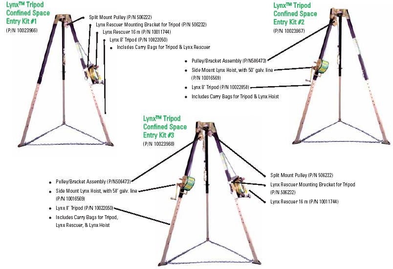 CONFINED SPACE ENTRY KITS Confined Space Entry Kits make it easy for you to order the Confined Space System which best suits your needs. The Confined Space Entry Kits feature: • 3 Tripod Kits and 2 Folding Davit Kits• Single part number for simplified ordering• Confined Space Kits with Lynx Rescuer allow for non-entry rescue of a confined space entrant• Tripod and Davit Kits allow for great portability• Training Video and Tripod Carrying Strap included within each kit