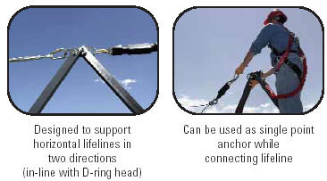 SKYLINK HLL STANCHION Economical Accommodates two workers per system Lightweight - weighs only 21 pounds, making it easily installed, removed, andhandled by 1 person Only a 24 hour cure time required for pour-in-place Pigtail anchor (min. 3,000 psiconcrete), so you won't hold up a job or slow down your crew. No tools required for installation when using pour-in-place anchor, making it easyto install - sets up in minutes! Can be used as single point anchor attachment, providing fall protection forworkers while installing horizontal lifelines Offers two installation methods to concrete, a pour-in-place anchor for newconstruction or concrete expansion bolts for existing construction, providing versatility to meet the requirements of your application Aluminum and steel construction increases durability to ensure long service life Folding leg stanchion design makes the stanchion easy to carry andconvenient to store No tie-back line required reduces trip hazards Meets ANSI A10.32 and OSHA requirements |