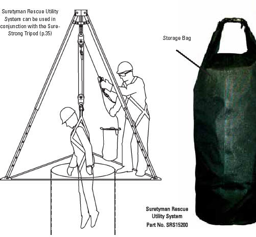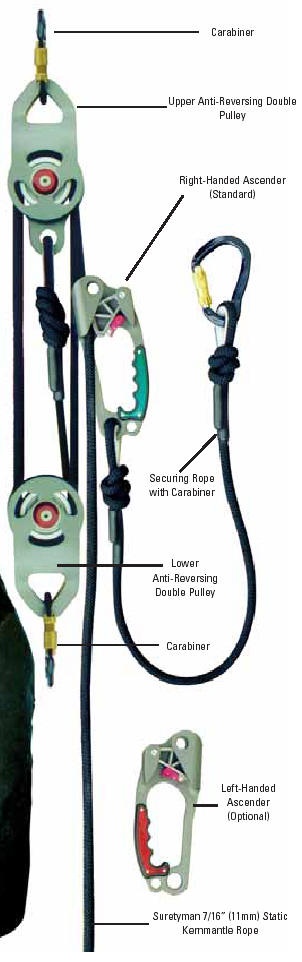 SURETYMAN RESCUE UTILITY SYSTEM The Suretyman Rescue Utility System incorporates all the features professionals have come to expect from a first class rescue system. The system is primarily used for raising and lowering people or equipment in rescue and industrial work access and is ideal for confined space applications. The Suretyman Rescue Utility System features: Pulleys equipped with a built-in anti-reversing lock Only a 10 lb force is all that is required to hold a 220 lb (90 kg) load Suretyman ascender attached to both the operating rope and the user via a securingrope - if the operating rope accidentally releases, the ascender automatically stops the descent Rapid deployment Virtually maintenance free Rated for 2-person load Compact and light weight with a standard system weight of 17 lb (7.7 kg) Versatile for rescue & access Multi-purpose ascent or descent Rated capacity of 600 lb (272 kg) for personnel and materials Standard rope length of 200 ft (66m) with a maximum rope length of 800 ft (267m)