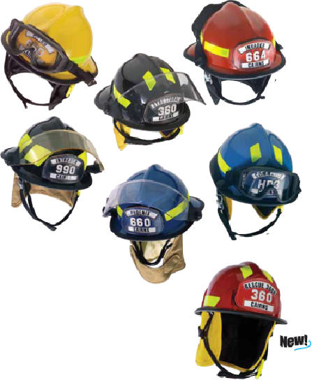 Standard Fronts Made with your choice of high-gloss patent leather or dull-finish genuine leather reinforced with a high-temperature, shrink-resistant back layer and sewn with high-temperature, fire-retardant Nomex thread. The Choice Is Yours! Standard fronts offer over 27 million possible configurations! Design your own standard front by choosing from the options and then indicating your preferences by calling 1-800-275-8239 to place your order. Crash Fire Rescue (CFR) Proximity System • Easy to don and doff, this CFR System is compliant with NFPA 1976–2000. • Designed and approved for use with the Metro 660C, Invader 664, Cairns 1010, Cairns 1044 and Classic 1000 Fire Helmets, it will not interfere with the SCBA while in use. • Components consist of an aluminized PBI/Kevlar layer, vapor barrier and inner layer. |