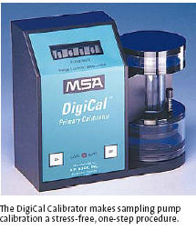 A primary calibration device,the DigiCal™ Calibrator provides instantaneous calibration for instruments like the MSA Escort LC or the secondary flow standard inside the Escort ELF Sampling Pumps.Just press the plunger and the DigiCal Calibrator does the work. Its unique flow cell replaces conventional bubble tubes and makes calibration easier. The DigiCal Calibrator achieves extreme accuracy by utilizing a computerized flow meter that provides instantaneous flow readouts on a digital display. Accurate measurements are possible within ± 0.5 percent at any altitude.For more complete information, see Bulletin 0810-34- MC |